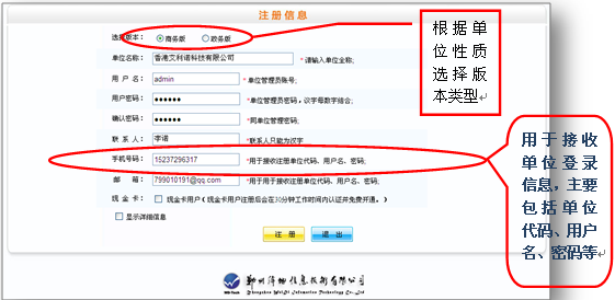 二、点击登录页面中的“注册”,按照内容提示正确填写单位注册信息。如图所示: