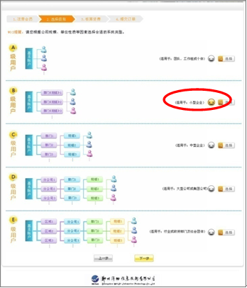 三、点击“注册”页面跳转到选择级别页面,根据根据企事业单位具体部门的划分情况选择用户使用级别。如图所示: