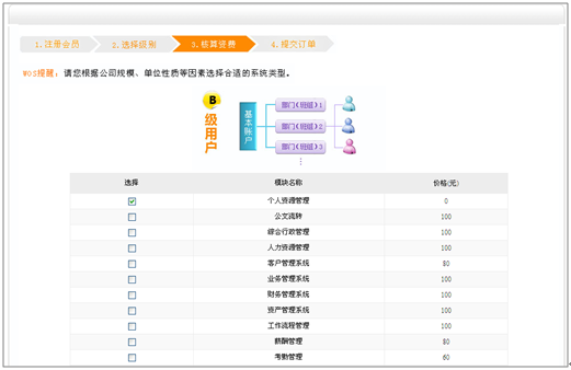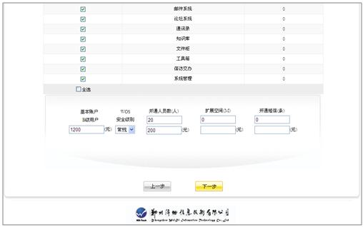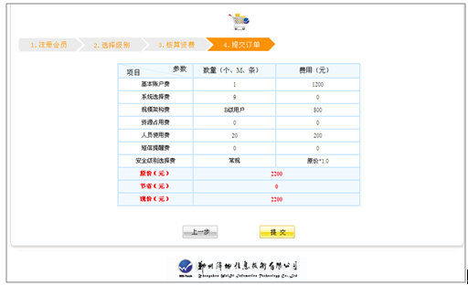 五、平台根据所选系统个数、基本账户类型、开通人数、空间等使用参数统计出平台的使用费用。如图所示:
