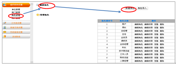 9.3 角色管理,根据员工的岗位职责不同,设置不同的权限,即保证了公司信息的保密性,又满足了个人职责权限的全面性。如图所示: